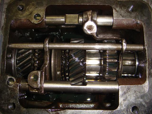 Blick in das Schaltgetriebe. Dieses besitzt drei Vorwärtsgänge und