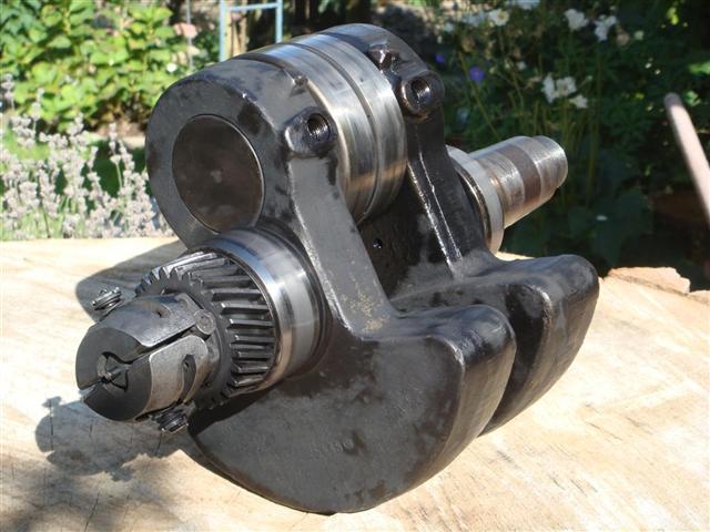 Die gewaltige Kurbelwelle mit angebautem Fliehkraft-Regler.